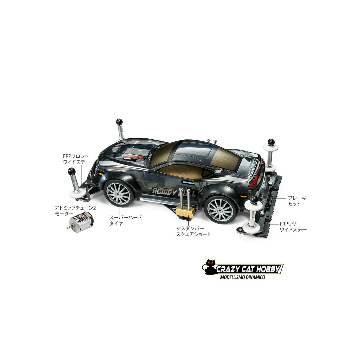 Included are an Atomic-Tuned 2 motor, super hard tires (black), brake set, short mass damper blocks and FRP front/rear plates.